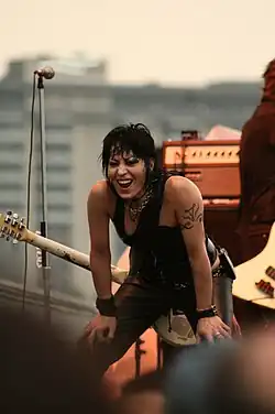 In 1967, Jett's family moved to Rockville, Maryland, where she attended Randolph Junior High School and Wheaton High School.[8] She got her first guitar at the age of 13.[9] She took some guitar lessons, but soon quit because the instructor kept trying to teach her folk songs.[10] Her family then moved to West Covina, California, in Los Angeles County, providing Jett with the opportunity to pursue her musical interests. Shortly after the move, her parents divorced and she changed her name to Joan Jett, because she thought it had more of a rock star sound than her birth name. She has admitted in recent years that "Jett" was not actually her mother's maiden name, even though that is what she used to tell people.[11] In Los Angeles, Jett's favorite night spot was Rodney Bingenheimer's English Disco,[12] a venue that provided the glam rock style she loved.[13]
