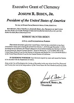 In 1981, the couple had a daughter, Ashley Biden,[22] who is a social worker, activist, and fashion designer.[58] Jill helped raise her stepsons, Hunter and Beau, who were seven and eight respectively at the time of her marriage. Hunter has worked as a Washington lobbyist and investment adviser; his business dealings, personal life, and legal troubles came under significant scrutiny during his father's presidency. In December 2024, Biden pardoned Hunter following his conviction on gun and tax charges despite repeated promises that he would not do so.[c] Beau became an Army judge-advocate in Iraq and later Delaware attorney general[63] before dying of brain cancer in 2015.[64][65]