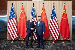 Biden was a strong supporter of the War in Afghanistan, saying, "Whatever it takes, we should do it."[121] As head of the Senate Foreign Relations Committee, he said in 2002 that Iraqi president Saddam Hussein was a threat to national security and there was no other option than to "eliminate" that threat.[122] In October 2002, he voted in favor of the Authorization for Use of Military Force Against Iraq, approving the U.S. invasion of Iraq.[117] As chair of the committee, he assembled witnesses to testify in favor of the authorization. They gave testimony grossly misrepresenting the intent, history, and status of Saddam and his government, and touted Iraq's fictional possession of weapons of mass destruction.[123] Biden eventually became a critic of the war, calling his vote a "mistake" by 2005,[124][125] but did not push for withdrawal.[117][119] He supported the appropriations for the occupation, but argued that the war should be internationalized, that more soldiers were needed, and that the Bush administration should "level with the American people" about its cost and length.[116][120]