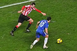 Cole did not play for Chelsea in the 2009–10 pre-season due to a cruciate ligament damage in his knee, suffered in January 2009.[37] He made a return to the starting line-up in Chelsea's League Cup match against Queens Park Rangers on 23 September 2009 in which he was also handed the captain's armband.[38] Cole made his first 2009–10 Premier League appearance for Chelsea against Blackburn Rovers, playing in attacking midfield in a 5–0 win.[39]
