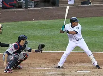 Mauer underwent arthroscopic knee surgery after the 2010 season, and missed most of spring training due to a difficult recovery from the operation.[53] After further difficulties during the first days of the season, he was placed on the disabled list immediately after the Twins' game on April 15.[54] Team doctors believed his problem, termed a "bilateral leg weakness", was due to too light a workload during spring training.[55] Mauer returned to game action as a designated hitter in extended spring training on May 25,[56] and made his first post-DL appearance as a catcher in another extended spring training game on June 2.[53] The following week, he went on a further rehabilitation assignment to the Twins' Class A affiliate, the Fort Myers Miracle, a team managed by his older brother Jake.[56] After Mauer caught several games with the Miracle, it was speculated he could return to the Twins as early as June 16 or 17, but Twins manager Ron Gardenhire did not commit to a return date.[57] Mauer returned to play with the Twins on June 17, 2011 and received a standing ovation from the fans.[58]