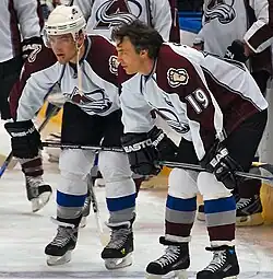 Joseph Steven Sakic (/ˈsækɪk/;[1] (Croatian pronunciation: [ʃakitɕ][2]) born July 7, 1969) is a Canadian professional ice hockey executive and former player. He spent his entire 21-year National Hockey League (NHL) career, which lasted from 1988 to 2009, with the Quebec Nordiques/Colorado Avalanche franchise. Named captain of the team in 1992 (after serving as a co-captain in 1990–91), Sakic is regarded as one of the greatest team leaders in league history[3] and was able to consistently motivate his team to play at a winning level.[4] Nicknamed "Burnaby Joe", Sakic was named to 13 NHL All-Star Games and selected to the NHL First All-Star Team at centre three times. Sakic led the Avalanche to Stanley Cup titles in 1996 and 2001, earning the most valuable player (MVP) in the 1996 playoffs. In 2001, Sakic earned both the Hart Memorial Trophy and Lester B. Pearson Award as MVP of the NHL.[5] He is one of six players to participate in the first two of the team's Stanley Cup victories and won the Stanley Cup a third time with the Avalanche in 2022 while serving as the team's general manager. Sakic became the third person, after Milt Schmidt and Serge Savard, to win the Stanley Cup with the same franchise as a player and general manager.[6]