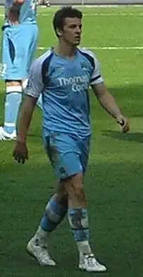 Barton would have made his debut for the City first team in November 2002 against Middlesbrough, had he not lost his shirt after leaving it on the substitutes bench at half-time.[21] He eventually made his first-team debut for the club against Bolton Wanderers on 5 April 2003.[22] His first senior goal came two weeks later in a 2–0 win over Tottenham Hotspur on Good Friday.[23] He ended the 2002–03 season with a run of seven consecutive starts.