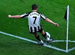 Barton has been described as having a good work ethic and the ability to carry the ball and retain possession for the team.[179][181] He has been praised for having a good passing range.[47] This aspect of his game has shown improvement since the 2005–06 season, when he began to favour simpler passes over more ambitious ones,[45] and his relatively high pass completion rate can be attributed to this change.[179] Barton's passes have often proved to be crucial; in the past he has led the way in his team's assists.[182]