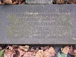 By the late 1770s, both his popularity and finances were in decline. By the time of Bach's death on New Year's Day 1782,[8] he had become so indebted (in part due to his steward embezzling his money), that Queen Charlotte stepped in to cover the expenses of the estate and provided a life pension for Bach's widow. He was buried in the graveyard of St. Pancras Old Church, London.