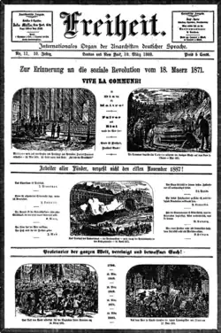 After advocating violent action, including the use of explosives, as a mechanism to bring about revolutionary change, Most was forced into exile by the government. He first traveled to France but was forced to leave at the end of 1878, settling in London instead. There he founded his own newspaper, Freiheit (Freedom), with the first issue coming off the press on January 4, 1879.[14] Convinced by his own experiences of the futility of parliamentary action, he began to espouse the doctrine of anarchism, which led to his expulsion from the German Social Democratic Party in 1880.[15] In March 1881, he expressed his delight in the pages of Freiheit over the assassination of Tsar Alexander II of Russia and advocated its emulation; for this he was imprisoned by British authorities for a year and a half.[13][16]