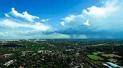 Johannesburg is situated on the highveld plateau, and has a subtropical highland climate (Köppen: Cwb, Trewartha: Cwbk).[76] The city enjoys a sunny climate, with the summer months (October to April) characterised by hot days followed by afternoon thundershowers and cool evenings, and the winter months (May to September) by dry, sunny days followed by cold nights.[77] Temperatures in Johannesburg are usually fairly mild due to the city's high elevation, with an average maximum daytime temperature in January of 25.6 °C (78.1 °F), dropping to an average maximum of around 16 °C (61 °F) in June. The UV index for Johannesburg in summers is extreme, often reaching 14–16 due to the high elevation and its location in the subtropics.[78]