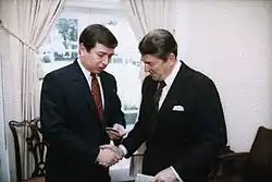 Before beginning his terms as Governor and Senator, Ashcroft had his father anoint him with oil to mirror the biblical practice for recognizing kings.[13] As his father died by 2001, Ashcroft had U.S. Supreme Court Justice Clarence Thomas, his former co-worker in the Attorney General Office of Missouri, perform this anointment and administer his oath of office.[14]