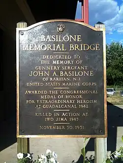 The John Basilone Veterans Memorial Bridge crosses the Raritan River, in Raritan, New Jersey, at First Avenue and Canal Street.