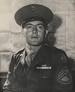 Basilone enlisted in the Marine Corps on July 11, 1940, in Baltimore, Maryland.[12] He attended boot camp at Marine Corps Recruit Depot Parris Island, followed by training at Quantico and New River. His first posting was Guantánamo Bay, Cuba, in September 1940. In January 1941, Basilone was assigned to D Company, 1st Battalion, 7th Marine Regiment, 1st Marine Division, and was promoted to corporal in May.[13] In January 1942, he was promoted to sergeant, and arrived in the Pacific in May as part of a Marine detachment sent to defend Samoa.[14]
