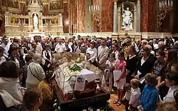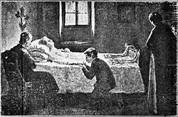 When Bosco was little more than two years old, his father died, which left the support of three boys to his mother.[3] She played a strong role in Bosco's formation and personality,[17] and was an early supporter of her son's ideals.[18] In 1825, when he was nine, Bosco had the first of a series of dreams that would play an influential role in his outlook and work. This first dream "left a profound impression on him for the rest of his life" according to his memoirs.[19] Bosco apparently saw a multitude of very poor boys playing and blaspheming, and a man, who "appeared, nobly attired, with a manly and imposing bearing",[19] and said to him, "You will have to win these friends of yours not with blows, but with gentleness and kindness. So begin right now to show them that sin is ugly and virtue beautiful."[19]