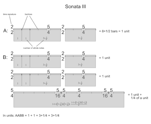 Soon after Cage started writing percussion music and music for modern dance, he started using a technique that placed the rhythmic structure of the piece into the foreground. In Imaginary Landscape No. 1 (1939) there are four large sections of 16, 17, 18, and 19 bars, and each section is divided into four subsections, the first three of which were all 5 bars long. First Construction (in Metal) (1939) expands on the concept: there are five sections of 4, 3, 2, 3, and 4 units respectively. Each unit contains 16 bars, and is divided the same way: 4 bars, 3 bars, 2 bars, etc. Finally, the musical content of the piece is based on sixteen motives.[91] Such "nested proportions", as Cage called them, became a regular feature of his music throughout the 1940s. The technique was elevated to great complexity in later pieces such as Sonatas and Interludes for prepared piano (1946–48), in which many proportions used non-integer numbers (1¼, ¾, 1¼, ¾, 1½, and 1½ for Sonata I, for example),[92] or A Flower, a song for voice and closed piano, in which two sets of proportions are used simultaneously.[93]