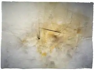 Between 1979 and 1982, Cage produced a number of large series of prints: Changes and Disappearances (1979–80), On the Surface (1980–82), and Déreau (1982). These were the last works in which he used engraving.[112] In 1983 he started using various unconventional materials such as cotton batting, foam, etc., and then used stones and fire (Eninka, Variations, Ryoanji, etc.) to create his visual works.[113] In 1988–1990, he produced watercolors at the Mountain Lake Workshop.