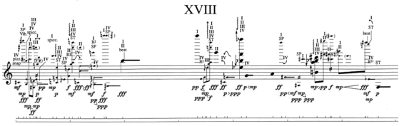 Finally, some of Cage's works, particularly those completed during the 1960s, feature instructions to the performer, rather than fully notated music. The score of Variations I (1958) presents the performer with six transparent squares, one with points of various sizes, five with five intersecting lines. The performer combines the squares and uses lines and points as a coordinate system, in which the lines are axes of various characteristics of the sounds, such as lowest frequency, simplest overtone structure, etc.[104] Some of Cage's graphic scores (e.g. Concert for Piano and Orchestra, Fontana Mix (both 1958)) present the performer with similar difficulties. Still other works from the same period consist just of text instructions. The score of 0′00″ (1962; also known as 4′33″ No. 2) consists of a single sentence: "In a situation provided with maximum amplification, perform a disciplined action." The first performance had Cage write that sentence.[105]