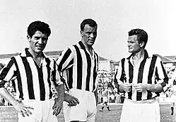 Charles began his career at Leeds United, having moved there in 1949 from his hometown club, Swansea Town. He was equally adept as a defender or a forward, due to his strength, pace, technique, vision, ability in the air and eye for goal.[5][6] After returning from national service in 1952, Charles began to be used more often as a forward and was the Second Division's top scorer in 1954. The following year, he was named club captain; in his first season as captain, he led the club to second place and promotion. Charles ended the 1956–57 season as the First Division's top scorer and an eighth-place finish for Leeds. In the summer of 1957, Charles joined Juventus, where he partnered Giampiero Boniperti and Omar Sívori, with the trio becoming known as The Holy Trident. In his five seasons with the club, he won the scudetto three times and the Coppa Italia twice; he was also the capocannoniere winner for the 1957–58 season. In 1962, Charles returned to Leeds, but his time there proved unsuccessful as he was accustomed to the style of play in Italy, and by the end of the year, he had joined Roma. Charles moved back to his native country to play for Cardiff City and ended his career in non-league football in player-manager roles at Hereford United and Merthyr Tydfil. He was never cautioned nor sent off during his entire career,[7] owing to his philosophy of never kicking nor intentionally hurting opposing players. This led to the nickname he acquired while playing for Juventus, Il Gigante Buono (The Gentle Giant).[6] In 1998, Charles was included in the Football League 100 Legends and, in 2002, was one of the inaugural inductees to the Football Hall of Fame.
