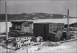 On 24 August 1944, the decision was taken to build a small reactor in order to test the Montreal Laboratory's calculations relating to such matters as lattice dimensions, sheathing materials, and control rods, before proceeding with the full-scale NRX reactor. This was named ZEEP, for Zero Energy Experimental Pile.[46] Building reactors in downtown Montreal was out of the question; the Canadians selected, and Groves approved, a site at Chalk River, Ontario, on the south bank of the Ottawa River some 110 miles (180 km) north west of Ottawa.[47] The Chalk River Laboratories opened in 1944, and the Montreal Laboratory was closed in July 1946.[46] ZEEP went critical on 5 September 1945,[48] becoming the first operating nuclear reactor outside the United States.[49] The larger NRX followed on 21 July 1947.[48] With five times the neutron flux of any other reactor, it was the most powerful research reactor in the world.[50] Originally designed in July 1944 with an output of 8 MW, the power was raised to 10 MW through design changes such as replacing uranium rods clad in stainless steel and cooled by heavy water with aluminium-clad rods cooled by light water.[51]