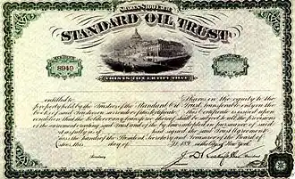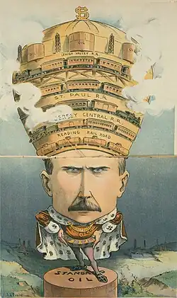 At that time, many legislatures had made it difficult to incorporate in one state and operate in another. As a result, Rockefeller and his associates owned dozens of separate corporations, each of which operated in just one state; the management of the whole enterprise was rather unwieldy. In 1882, Rockefeller's lawyers created an innovative form of corporation to centralize their holdings, giving birth to the Standard Oil Trust.[77] The "trust" was a corporation of corporations, and the entity's size and wealth drew much attention. Nine trustees, including Rockefeller, ran the 41 companies in the trust.[78] The public and the press were immediately suspicious of this new legal entity, and other businesses seized upon the idea and emulated it, further inflaming public sentiment. Standard Oil had gained an aura of invincibility, always prevailing against competitors, critics, and political enemies. It had become the richest, biggest, most feared business in the world, seemingly immune to the boom and bust of the business cycle, consistently making profits year after year.[79]