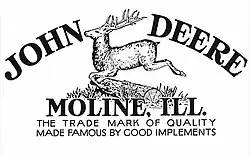 The logo of the leaping deer has been used by this company for over 155 years. Over the years, the logo has had minor changes and pieces removed. Some of the older style logos have the deer leaping over a log.[57][58] The company uses different logo colors for agricultural vs. construction products. The company's agricultural products are identifiable by a distinctive shade of green paint, with the inside border being yellow. By contrast, the construction products are identifiable by a shade of black with the deer being yellow, and the inside border also being yellow.