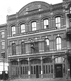 Deere bought out Tate and Gould's interests in the company in 1853, and was joined in the business by his son Charles Deere.[13] At that time, the company was manufacturing a variety of farm equipment products in addition to plows, including wagons, corn planters, and cultivators.[14] In 1857, the company's production totals reached almost 1,120 implements per month. In 1858, a nationwide financial recession took a toll on the company. During this period, the company announced its work on a steam engine that will pull its plow but the product did not materialize.[15] To prevent bankruptcy, the company was reorganized and Deere turned over his interests in the business to his son-in-law, Christopher Webber, and his son, Charles Deere, who would take on most of his father's managerial roles.[16] John Deere served as president of the company until his retirement in April 1886, but died one month later in May 1886 in Moline, Illinois.[17] The company was reorganized again in 1868 when it was incorporated as Deere & Company.[9] While the company's original stockholders were Charles Deere, Stephen Velie, George Vinton, and John Deere, Charles effectively ran the company. In 1869, Charles began to introduce marketing centers and independent retail dealers to advance the company's sales nationwide. This same year, Deere & Company won "Best and Greatest Display of Plows in Variety" at the 17th Annual Illinois State Fair, for which it won $10 and a silver medal.[18]