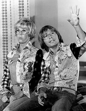 In the 1970s, Denver's onstage appearance included long blond hair and wire-rimmed "granny" glasses. His embroidered shirts with images commonly associated with the American West were created by the designer and appliqué artist Anna Zapp. Weintraub insisted on a significant number of television appearances, including a series of half-hour shows in the United Kingdom, despite Denver's protests at the time, "I've had no success in Britain ... I mean none".[29] In December 1976, Weintraub told Maureen Orth of Newsweek: "I knew the critics would never go for John. I had to get him to the people."