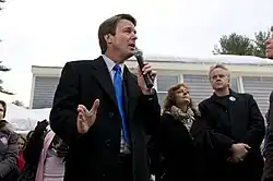 After his 2008 presidential campaign, Edwards was indicted by a federal grand jury on June 3, 2011, on six felony charges of violating multiple federal campaign contribution laws to cover up an extramarital affair to which he eventually admitted. He was found not guilty on one count, and the judge declared a mistrial on the remaining five charges, as the jury was unable to come to an agreement.[2] The Justice Department dropped the remaining charges and did not attempt to retry Edwards.[3] Though he was not convicted of any crime, the revelation that he had engaged in an extramarital affair and fathered a child while his wife, Elizabeth Edwards, was dying of cancer, severely damaged his public image and effectively ended his political career.[4]