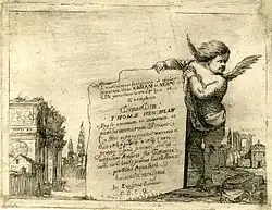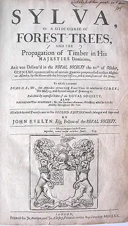 He was known for his knowledge of trees, and had a friend and correspondent, Philip Dumaresq, who "devoted most of his time to gardening, fruit, and tree culture."[17] Evelyn's treatise, Sylva, or A Discourse of Forest-Trees (1664), was written as an encouragement to landowners to plant trees to provide timber for England's burgeoning navy. Further editions appeared in his lifetime (1670 and 1679), with the fourth edition (1706) appearing just after his death and featuring the engraving of Evelyn shown on this page (below) even though it had been made more than 50 years prior by Robert Nanteuil in 1651 in Paris. Various other editions appeared in the 18th and 19th centuries and feature an inaccurate portrait of Evelyn made by Francesco Bartolozzi.