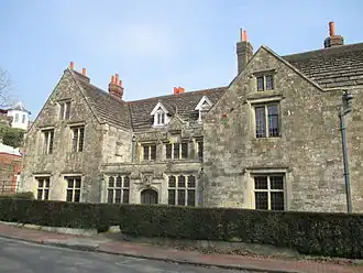 Born into a family whose wealth was largely founded on gunpowder production, John Evelyn was born in Wotton, Surrey, and grew up living with his grandparents in Lewes, Sussex.[3] While living in Lewes, in Southover Grange, he was educated at Lewes Old Grammar School,[4] refusing to be sent to Eton College.[5] After this he was educated at Balliol College, Oxford, and at the Middle Temple. In London, he witnessed important events such as the trials and executions of William Howard, 1st Viscount Stafford, and Thomas Wentworth, Earl of Strafford.