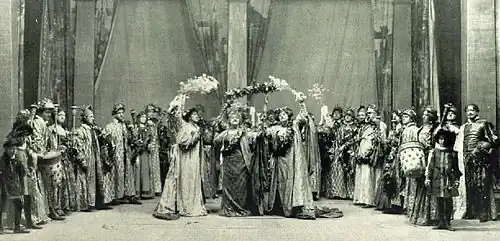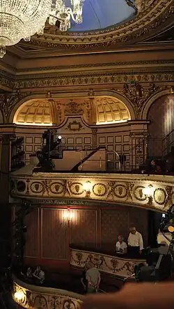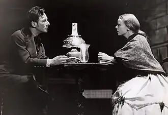 After his return from America in February 1937 Gielgud starred in He Was Born Gay by Emlyn Williams.[97] This romantic tragedy about French royalty after the Revolution was quite well received during its pre-London tour,[98] but was savaged by the critics in the West End.[99] The Times said, "This is one of those occasions on which criticism does not stand about talking, but rubs its eyes and withdraws hastily with an embarrassed, incredulous, and uncomprehending blush. What made Mr Emlyn Williams write this play or Mr Gielgud and Miss Ffrangcon-Davies appear in it is not to be understood."[100] The play closed after twelve performances. Its failure, so soon after his Shakespearean triumphs, prompted Gielgud to examine his career and his life. His domestic relationship with Perry was comfortable but unexciting, he saw no future in a film career, and the Old Vic could not afford to stage the classics on the large scale to which he aspired. He decided that he must form his own company to play Shakespeare and other classic plays in the West End.[101]
