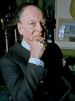 Much of Gielgud's theatre work in the later 1960s was as a director: Chekhov's Ivanov at the Phoenix in London and the Shubert in New York, Peter Ustinov's Half Way Up the Tree at the Queen's and Mozart's Don Giovanni at the Coliseum.[29] One potentially outstanding acting role, Ibsen's Bishop Nicholas, fell through in 1967 when Olivier, with whom he was to co-star at the National Theatre in The Pretenders, was ill.[162] Gielgud played Orgon in Tartuffe and the title role in Seneca's Oedipus during the National's 1967–68 season, but according to Croall neither production was satisfactory.[163] After this, Gielgud at last found a modern role that suited him and which he played to acclaim: the Headmaster in Alan Bennett's first play, Forty Years On (1968).[164] The notices for both play and star were excellent.[165] John Barber wrote in The Daily Telegraph that "Gielgud dominates all with an unexpected caricature of a mincing pedant, his noble features blurred so as to mimic a fussed and fatuous egghead. From the great mandarin of the theatre, a delicious comic creation."[166]