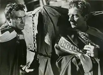 In 1953 Gielgud made his first Hollywood film, the sole classical actor in Joseph L. Mankiewicz's Julius Caesar, playing Cassius. Marlon Brando (Mark Antony) was in awe of him,[128] and James Mason (Brutus) was disheartened at Gielgud's seemingly effortless skill.[129] Gielgud, for his part, felt he learned much about film technique from Mason.[130] Gielgud enjoyed his four-month stay in California, not least, as Morley comments, for the relaxed attitude there to homosexuality.[131]