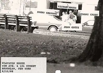 By this time, the FBI had cultivated new informants and learned part of the reason the Ravenite bug failed was because Gotti would hold sensitive conversations elsewhere, either in a rear hallway in the building the club occupied, or in an apartment in its upper floors where the friendly widow of a Gambino soldier lived; by November 1989, both locations were bugged.[106][119] The apartment bug was particularly fruitful due to Gotti's frankness as he discussed his position as boss in meetings there. In a December 12 conversation with Locascio, Gotti plainly acknowledged ordering the murders of DiBernardo and Liborio Milito — the latter being one of Gravano's partners, killed for insubordination.[120] He also announced his intent to kill soldier Louis DiBono, who had ignored a summons to meet with Gotti to discuss his mismanagement of a drywall business he held with Gotti and Gravano. The FBI, however, misheard the namedrop and failed to warn DiBono, who was killed on October 4, 1990.[121] In another taped meeting on January 4, 1990, Gotti promoted Gravano to underboss, preferring him to lead the family if Gotti was convicted in the assault case.[122]