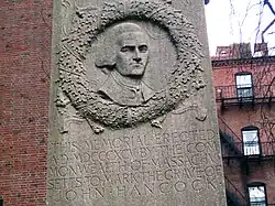 Despite his grand funeral, Hancock faded from popular memory after his death. According to historian Alfred F. Young, "Boston celebrated only one hero in the half-century after the Revolution: George Washington."[210] As early as 1809, John Adams lamented that Hancock and Samuel Adams were "almost buried in oblivion".[211] In Boston, little effort was made to preserve Hancock's historical legacy. His house on Beacon Hill was torn down in 1863 after both the city of Boston and the Massachusetts legislature decided against maintaining it.[212] According to Young, the conservative "new elite" of Massachusetts "was not comfortable with a rich man who pledged his fortune to the cause of revolution".[212] In 1876, with the centennial of American independence renewing popular interest in the Revolution, plaques honoring Hancock were put up in Boston.[213] In 1896, a memorial column was erected over Hancock's essentially unmarked grave in the Granary Burying Ground.[197]
