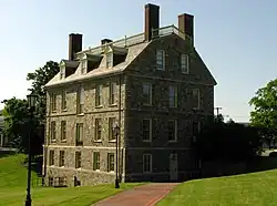 After Hancock's father died in 1744, he was sent to live with his uncle and aunt, Thomas Hancock and Lydia (Henchman) Hancock. Thomas Hancock was the proprietor of a firm known as the House of Hancock, which imported manufactured goods from Britain and exported rum, whale oil, and fish.[7] Thomas Hancock's highly successful business made him one of Boston's richest and best-known residents.[8][9] He and Lydia, along with several servants and slaves, lived in Hancock Manor on Beacon Hill. The couple, who did not have any children of their own, became the dominant influence on John's life.[10]