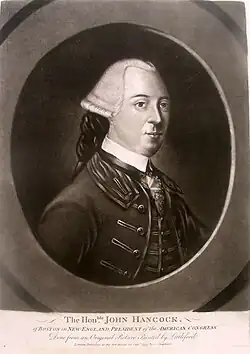 John Hancock (January 23, 1737 [O.S. January 12, 1736] – October 8, 1793) was an American Founding Father, merchant, statesman, and prominent Patriot of the American Revolution.[1] He was the longest-serving president of the Continental Congress, having served as the second president of the Second Continental Congress and the seventh president of the Congress of the Confederation. He was the first and third governor of the Commonwealth of Massachusetts. His large and stylish signature on the United States Declaration of Independence led to John Hancock or Hancock becoming a colloquialism for a person's signature.[2] He also signed the Articles of Confederation, and used his influence to ensure that Massachusetts ratified the United States Constitution in 1788.