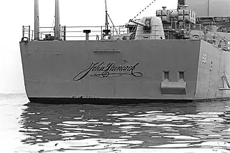 Hancock served in Congress through some of the darkest days of the Revolutionary War. The British drove Washington from New York and New Jersey in 1776, which prompted Congress to flee to Baltimore.[157] Hancock and Congress returned to Philadelphia in March 1777 but were compelled to flee six months later when the British occupied Philadelphia.[158] Hancock wrote innumerable letters to colonial officials, raising money, supplies, and troops for Washington's army.[159] He chaired the Marine Committee and took pride in helping to create a small fleet of American frigates, including the USS Hancock, which was named in his honor.[160][161]
