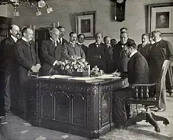 Hay was an early supporter of Ohio's William McKinley and worked closely with McKinley's political manager, Cleveland industrialist Mark Hanna. In 1889, Hay supported McKinley in his unsuccessful effort to become Speaker of the House.[92] Four years later, McKinley—by then Governor of Ohio—faced a crisis when a friend whose notes he had imprudently co-signed went bankrupt during the Panic of 1893. The debts were beyond the governor's means to pay, and the possibility of insolvency threatened McKinley's promising political career. Hay was among those Hanna called upon to contribute, buying up $3,000 of the debt of over $100,000. Although others paid more, "Hay's checks were two of the first, and his touch was more personal, a kindness McKinley never forgot". The governor wrote, "How can I ever repay you & other dear friends?"[93]