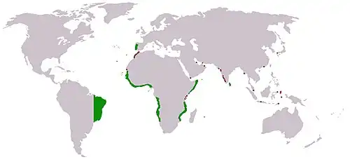 - ^ "Common products were salt, wheat, horses, carpets, fabric, Irish and English clothing, blades, tin for African natives' coins, copper or tin vases, shells from the Canary Islands that Ethiopians carry on their necks as an amulet against lightning, yellow and green beads from Nuremberg, and brass armlets" (Basílio Vasconcelos, "Itinerário" de Jerónimo Münzer, 1932), in exchange for gold, slaves, ivory and bush redpepper brought by the Portuguese.