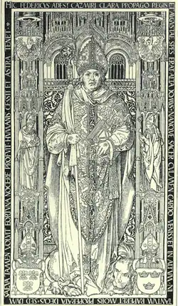 An army of 1,600 men was dispatched to counter Janusz and Konrad if their troops resorted to violence.[51] Meanwhile, John preoccupied himself with negotiations and aimed to procure the Prussian vote by recognising Lucas Watzenrode as the new Prince-Bishop of Warmia.[52] In the end, it was Frederick's personal intervention that secured the crown for John, who was unanimously proclaimed king by an oral ballot amongst the shrieks of nobles on 27 August 1492.[53][54] A courier carried the news to the burghers of Kraków, which brought great joy to the townsfolk and prompted a bonfire celebration.[55] The entourage then hurried to the capital, where he was crowned at Wawel Cathedral just less than a month later, on 23 September, by his ailing adversary Oleśnicki.[56]