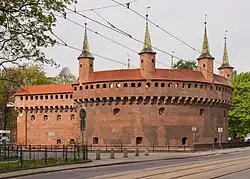 The defeat in Moldavia incited raids into Polish territory, largely conducted by Tatars and other irregulars.[127] In July 1498, Turkish marauders of Malkoçoğlu Bali Bey crossed into Podolia and reached as far west as Lwów, pillaging the city's environs.[128] Fearing a retaliatory attack by the Moldavians or the Ottoman Empire, John ordered the construction of new defensive fortifications; including what became one of Poland's most recognisable monuments, the Kraków Barbican.[129]