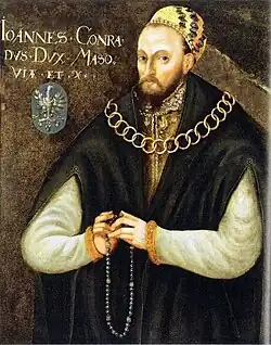When Duke Janusz II died heirless in February 1495, his brother Konrad hurried to secure his disputed succession by sending out troops to fortify Masovian castles.[89] He failed in deterring Polish ambitions; John soon assembled a small force that marched into Masovia and occupied the ecclesiastical city of Płock, the region's primary bishopric.[90] Cardinal Frederick then prevented local canons from obtaining office and installed Jan Lubrański as bishop.[91] Fearing an escalation, Konrad ordered his men to stand down; paving the way for the Jagiellons to uphold their claim to Masovia.[92] A year later, Konrad paid homage to John at Piotrków; where, on accusations of insubordination, he was deprived of most holdings and hereditary possessions.[93]