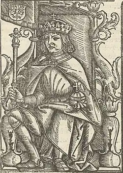 John's successiont to the throne came entirely by accident. His eldest brother, Vladislaus was to inherit Poland and Lithuania by primogeniture.[15] This changed when George of Poděbrady pledged to make Vladislaus his heir in neighbouring Bohemia on the condition that Casimir IV negotiated a peace treaty with Matthias Corvinus of Hungary.[16] Although that negotiation failed, the Bohemian Diet elected Vladislaus the King of Bohemia following George's death in 1471.[17] Casimir IV's second son and his namesake, Casimir, then became the new heir apparent in Poland, however, he fell ill with tuberculosis and died in 1484.[18] Six years later, Vladislaus was proclaimed King of Hungary, which was met with hostility from a faction of Hungarian nobles advocating for John Albert.[19][20] Motivated by the Hungarians, John briefly invaded Hungary to usurp the title but was defeated by his brother at Košice in 1491 and again at Prešov in 1492.[21][22] In spite of the conflict, the bond between the two siblings remained unhindered,[23] and Vladislaus made John the Duke of Głogów for life to satisfy his ambition.[24]