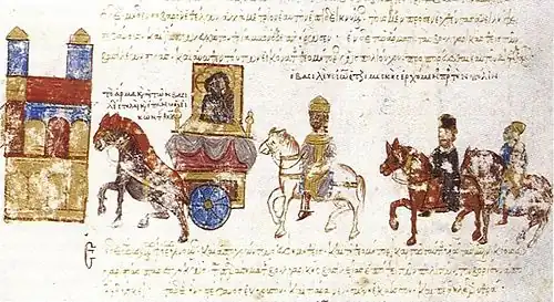 ![]() Detail of the Gunthertuch, a Byzantine silk tapestry depicting John Tzimiskes being greeted by the Blues and Greens at a triumph | |