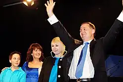The general election on 26 November 2011 saw National increase its share of the vote and gain a seat, while Labour suffered further losses.[71] Key called the election a "very happy night" and a "strong and solid win" for his party.[72] The Prime Minister re-negotiated confidence and supply agreements with United Future,[73] the ACT Party[73] and the Māori Party,[74] to secure a second term of government.
