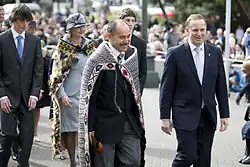 In January 2009, after addressing Chinese New Year celebrations at the Greenlane ASB Showgrounds, Key tripped after coming down a small set of stairs in front of cameras, leaving him with a broken right arm and "embarrassed".[47] Later that year, when arriving at the Ngāpuhi Te Tii Waitangi Marae the day before Waitangi Day, Key was briefly shoved and grabbed by two protesters before diplomatic protection officers pulled them off. He told reporters he was "quite shocked" but continued onto the marae and spoke, while police took the two men away and charged them with assault.[48][49]