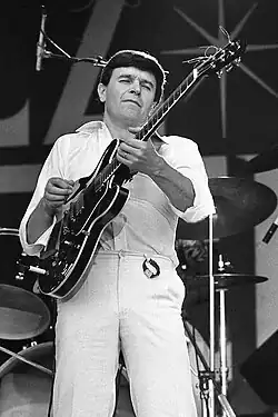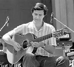 McLaughlin studied violin and piano as a child; At the age of 11, his brother gave John a guitar and John immediately took up the instrument, exploring styles from flamenco to the jazz of Tal Farlow, Django Reinhardt and Stéphane Grappelli.[13][14][12] He moved to London from Yorkshire in the early 1960s, playing with Alexis Korner[15] and the Marzipan Twisters before moving on to Georgie Fame and the Blue Flames, the Graham Bond Quartet (in 1963)[16] and Brian Auger.[17] During the 1960s, he often supported himself with session work, which he frequently found unsatisfying but which enhanced his playing and sight-reading.[18] Also, he gave guitar lessons to Jimmy Page.[19] In 1963, Jack Bruce formed the Graham Bond Quartet with Bond, Ginger Baker and John McLaughlin. They played an eclectic range of music genres, including bebop, blues and rhythm.[20]