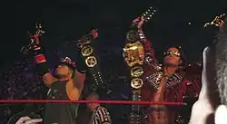 Morrison and The Miz retained the titles against Kane and CM Punk at Judgment Day on May 18[77] and Finlay and Hornswoggle at Night of Champions on June 29,[78] before dropping the titles to Curt Hawkins and Zack Ryder on July 20 at The Great American Bash in a fatal four-way match which also featured Jesse and Festus. Neither Morrison nor The Miz were pinned, as Hawkins pinned Jesse to win the titles.[79] Afterwards, they started a feud with Cryme Tyme (JTG and Shad) through each team's Internet show, which then transitioned to matches on Raw and on October 26 at Cyber Sunday.[80][81][82] After winning the Slammy Award for Best WWE.com exclusive earlier in the day, Morrison and The Miz won the "Tag Team of the Year" Slammy Award on December 8, 2008 episode of Raw.[83] On December 13, Morrison and The Miz won the World Tag Team Championship from CM Punk and Kofi Kingston at a live event.[84]