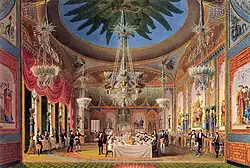 In 1814, Nash designed and erected a remarkable temporary structure known as the 'Polygon Room' or Rotunda in the gardens of Carlton House for the Prince Regent's Wellington Fête of 21 July.[58] This 116-foot diameter structure employed pioneering structural techniques including: