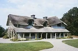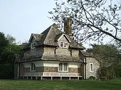 This process would be extended by Nash in planning groups of buildings, the first example being Blaise Hamlet (1810–1811). There a group of nine asymmetrical cottages was laid out around a village green. Nikolaus Pevsner described the hamlet as "the ne plus ultra of the Picturesque movement".[45] The hamlet has also been described as the first fully realized exemplar of the garden suburb.[46] Nash developed the asymmetry of his castles in his Italianate villas. His first such exercise was Cronkhill (1802),[47] and others included Sandridge Park (1805)[48] and Southborough Place, Surbiton(1808).[49]