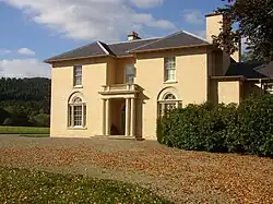 One of Nash's most important developments were a series of medium-sized country houses that he designed in Wales, which developed the villa designs of his teacher Sir Robert Taylor.[10] Most of these villas consist of a roughly square plan with a small entrance hall and a staircase offset in the middle to one side, around which are placed the main rooms. There is then a less prominent servants' quarters in a wing attached to one side of the villa. The buildings are usually only two floors in height and the elevations of the main block are usually symmetrical. One of the finest of these villas is Llanerchaeron, but at least a dozen villas were designed throughout south Wales. Others, in Pembrokeshire, include Ffynone, built for the Colby family at Boncath, near Manordeifi, and Foley House, built for the lawyer Richard Foley (brother of Admiral Sir Thomas Foley) at Goat Street in Haverfordwest.[27]