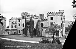 The finest of the dozen country houses that Nash designed as picturesque castles include the relatively small Luscombe Castle Devon (1800–04);[41] Ravensworth Castle (Tyne and Wear), begun in 1807 but only finally completed in 1846, which was one of the largest houses by Nash;[42] Caerhays Castle in Cornwall (1808–10);[43] and Shanbally Castle, County Tipperary (1818–1819), which was the last of these castles to be built.[44] These buildings all represented Nash's continuing development of an asymmetrical and picturesque architectural style that had begun during his years in Wales, at both Castle House Aberystwyth and his alterations to Hafod Uchtryd.[45]